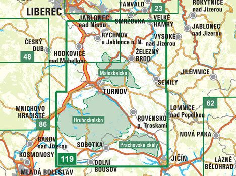 119. CHKO Český ráj 1 : 25 000 – mapa s letní a zimní turistickou nadstavbou, souřadnicová síť WGS 84, zeměpisná síť po jedné minutě.