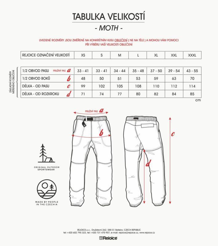 Nohavice jsou ukončeny tunýlkem s pružnou kulatou gumou a samosvorkou na stahování pro pohodlnější úpravu nohavic.